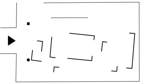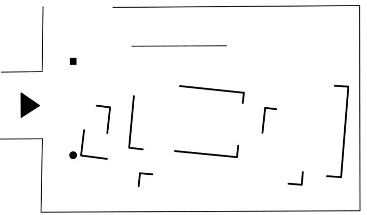Die zweidimensionale Projektion der Ausstellung mit um 4° zum Raum gedrehten Wänden.